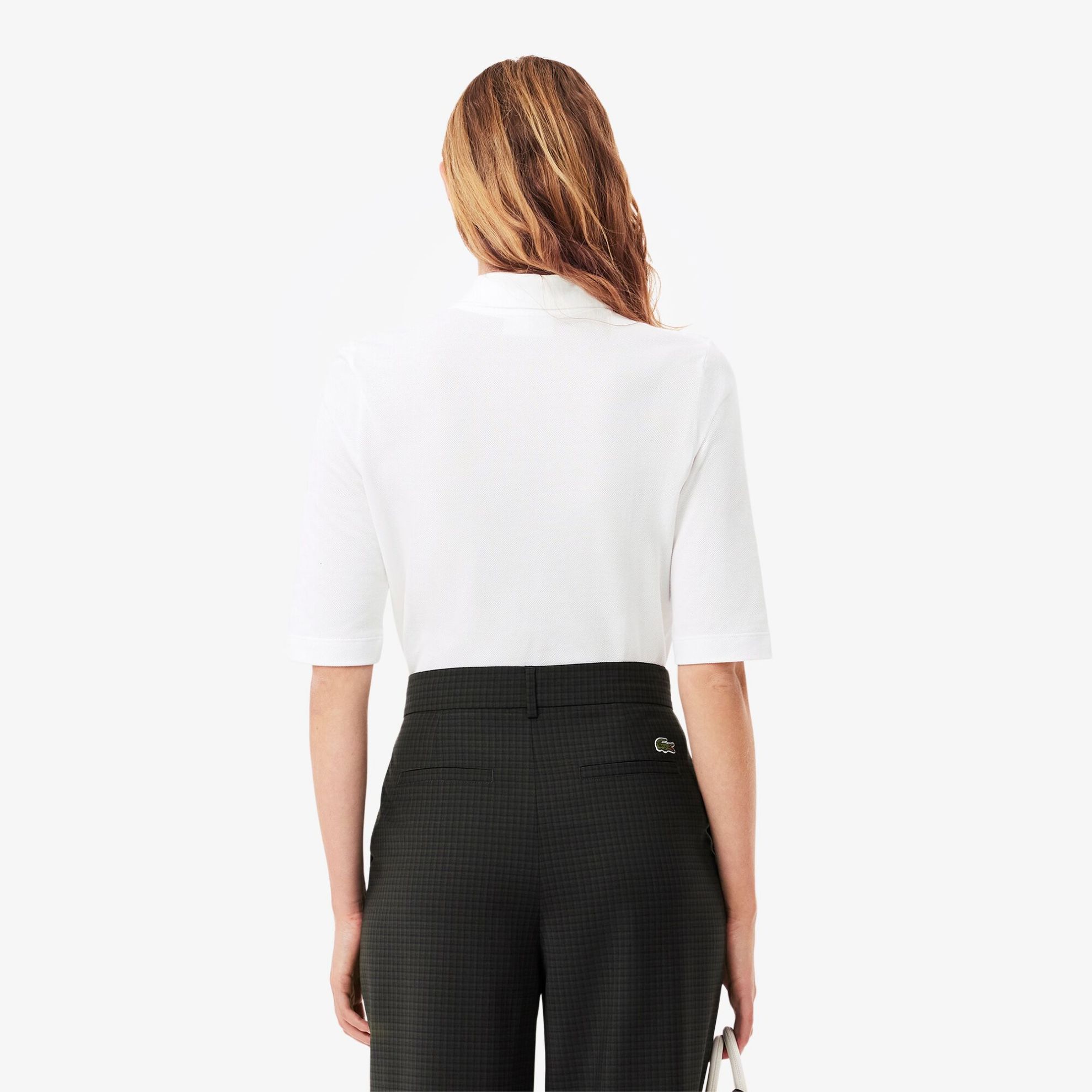 Ένα θηλυκό, μίνιμαλ στυλ της κλασικής polo μπλούζας από τη Lacoste, τους δημιουργούς του σχεδίου το 1933. Κατασκευασμένη από απαλό, κομψό ύφασμα πικέ με εντυπωσιακά μανίκια τριών τετάρτων. Ένα απαραίτητο κομμάτι γκαρνταρόμπας με εκλεπτυσμένες λεπτομέρειες φινιρίσματος, συμπεριλαμβανομένου του τονικού κροκοδείλου-σήματος.