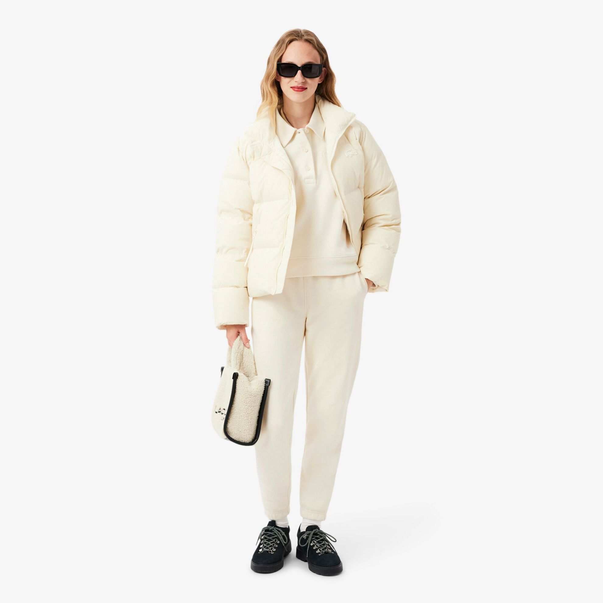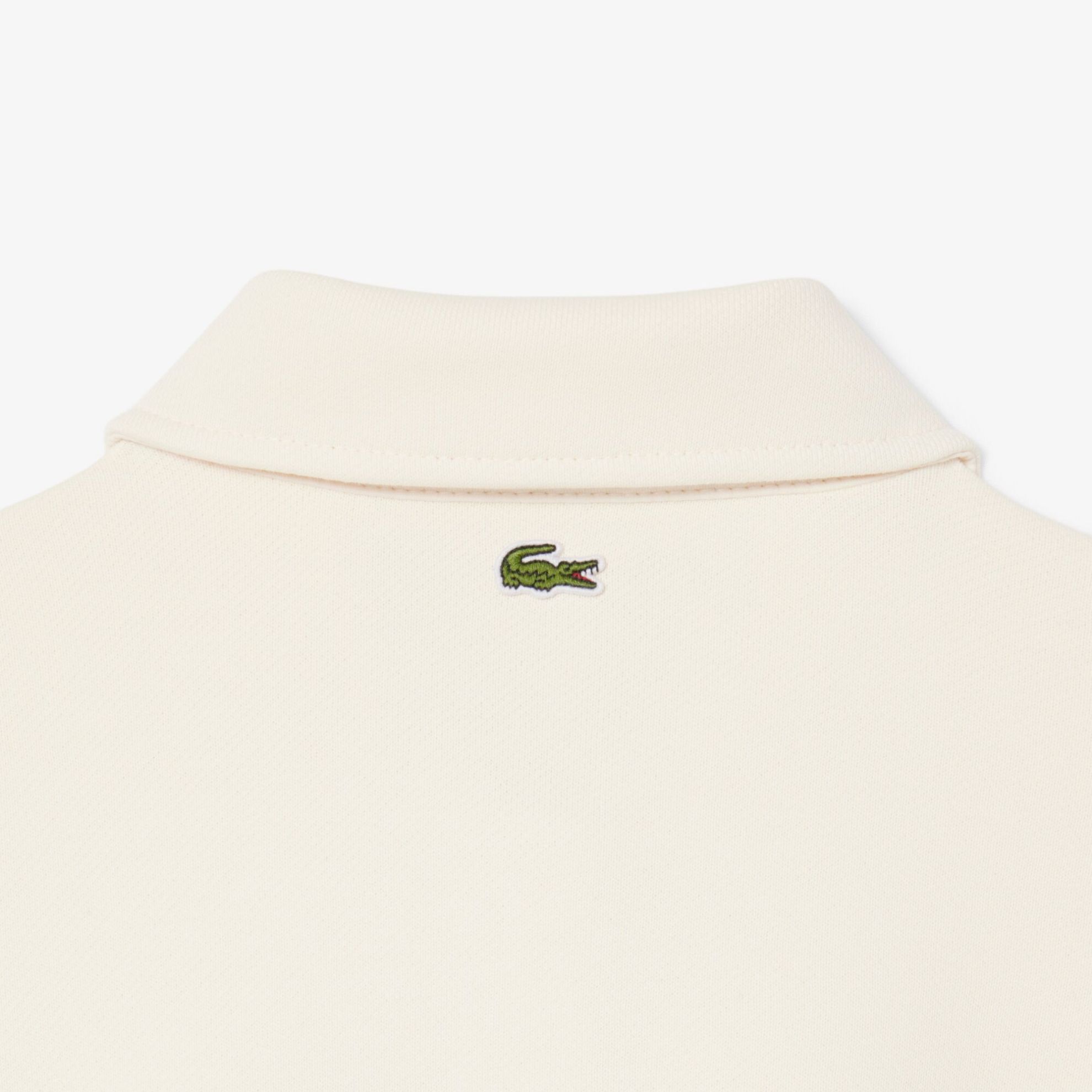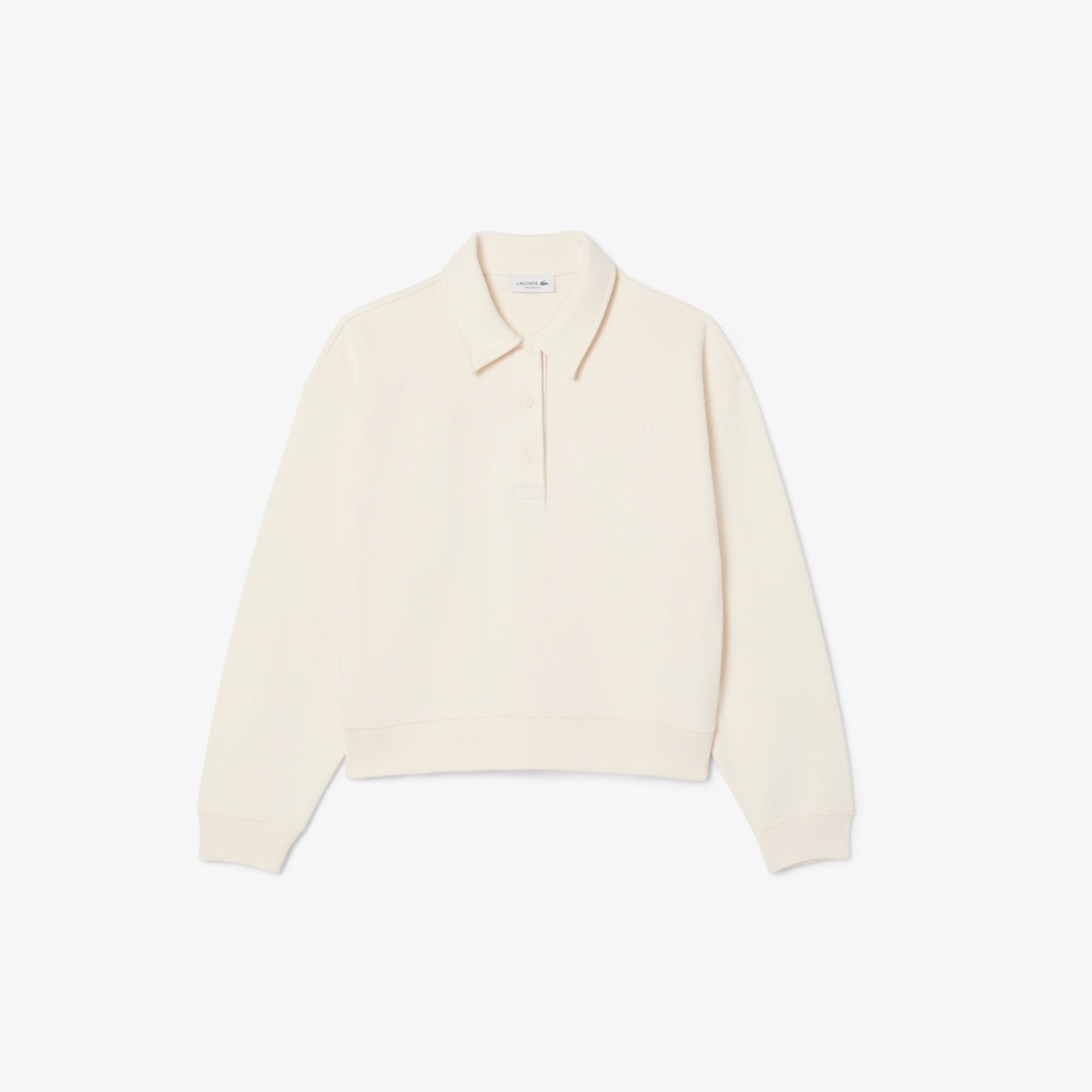 Ένα θηλυκό φούτερ από την Lacoste, δημιουργούς αθλητικών ρούχων από το 1933. Κατασκευασμένο από βαμβακερό ύφασμα fleece με άνετο κόψιμο, καθώς και ραβδώσεις στις άκρες, γιακάς πόλο με κουμπιά και ανάγλυφη επωνυμία Lacoste στο στήθος.